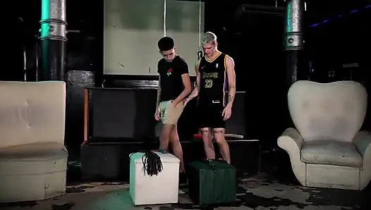 It's the first time Chase and his blond buddy Andreas have visited the club but when they find some appropriate kinky toys to use they don't hesitate. Andreas quickly asserts his dominance, handcuffing his friend and roping him up, feeding his boy his rigid wet tool. With just a few swipes of the hurtful flogger against his boy's bare ass he's ready to fill that twink hole, jabbing his raw meat between the cheeks and filling the boy up. Giving his bottom some freedom lets him properly pound that pucker over the chair, using Chase until he's ready to breed that hole with his fresh goo, fucking his cream into him. Chase can feel the semen dripping out of him while he jacks out his own warm mess.